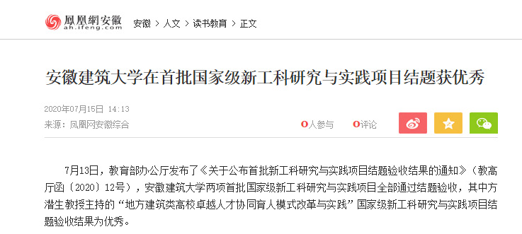 编者按:近日,我校两项首批国家级新工科研究与实践项目全部通过结题验收,其中方潜生教授主持的“地方建筑类高校卓越人才协同育人模式改革与实践”国家级新工科研究与实践项目结题验收结果为优秀。7月15日,凤凰网安徽对此进行了报道。